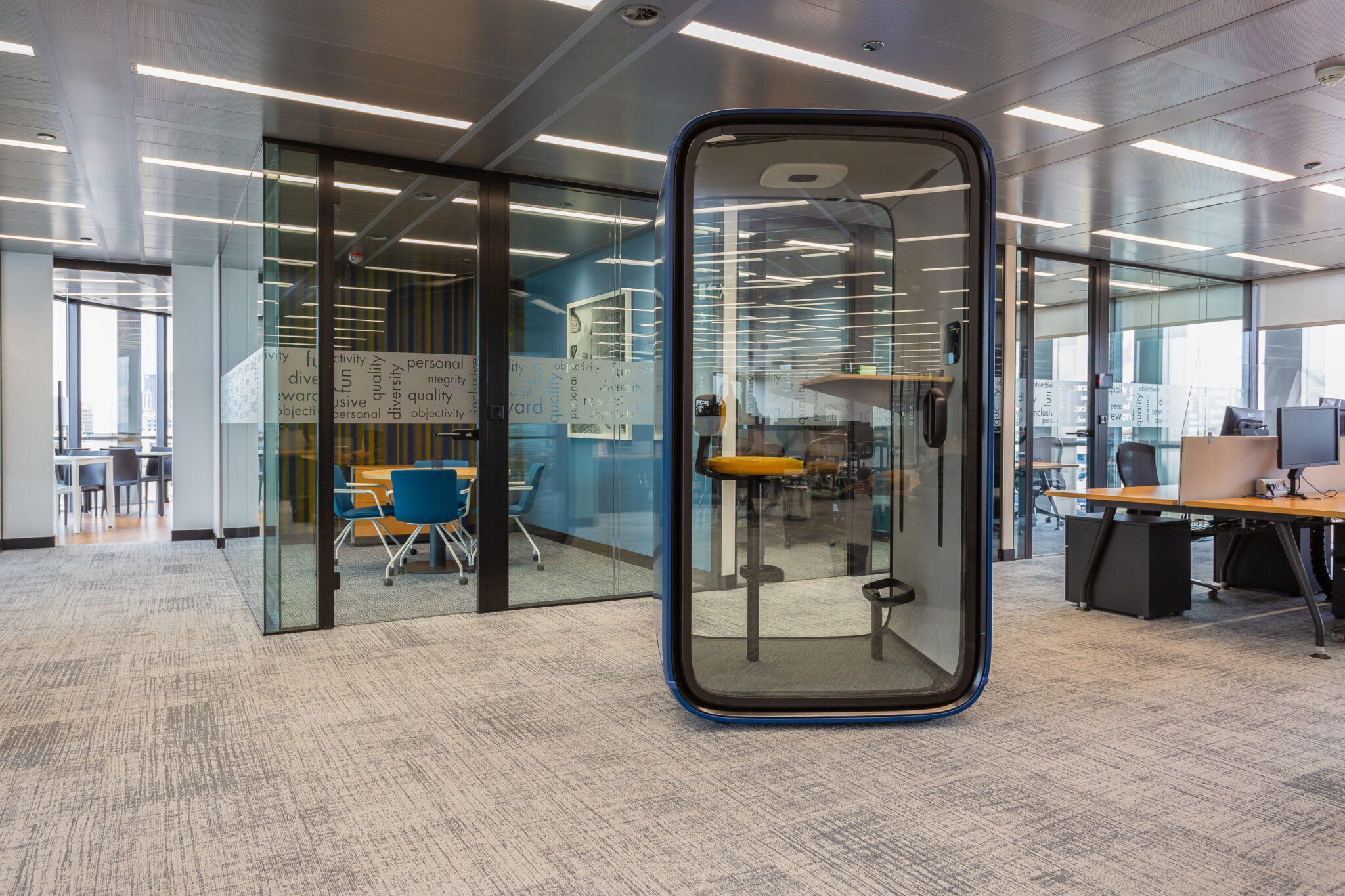 This new space had to consider the remote and face-to-face model, and also guarantee the concentration and silence, at the office. For it, this new design for A&M shows much importance on the spaces as meeting rooms and phone booths with acoustics certifications.