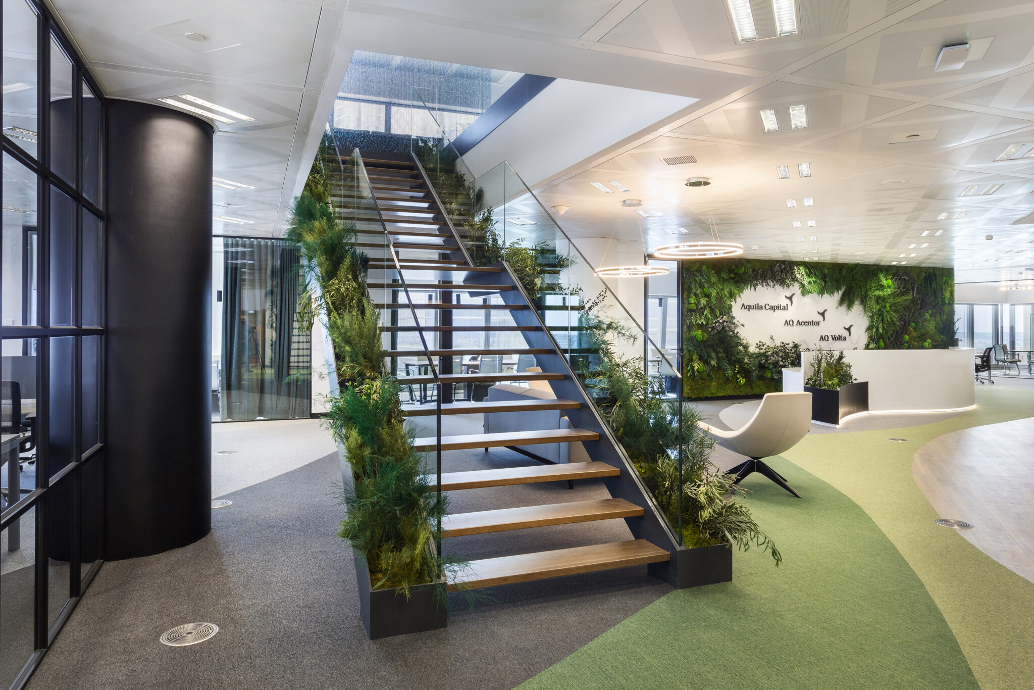 The major key goal had been marked by the need to connect more than 2,500m2 on two floors. A connection that could not be left to the common areas of stairs and lifts in the tower, so we devised an organic route that contemplated an interior connecting staircase, a protagonist staircase that with elements of wellbeing that evoked Aquila’s Brand purpose.