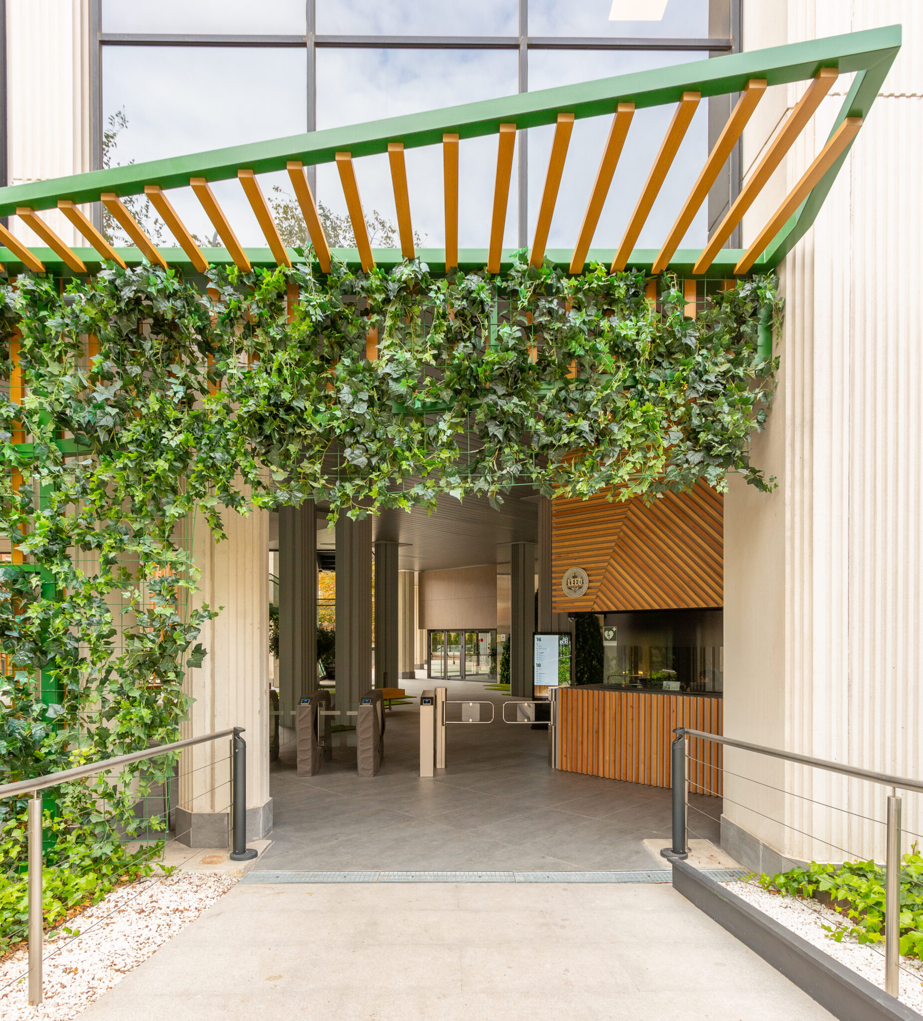 The creative idea of plug&go starts the experience from the outdoor (a large austere porch, full of pillars and without a hint of warmth). We created squares with different uses and brought the vegetation of the area closer to the interior. The building’s reception is also installed on the outside, connected and welcoming like a warm and green embrace.