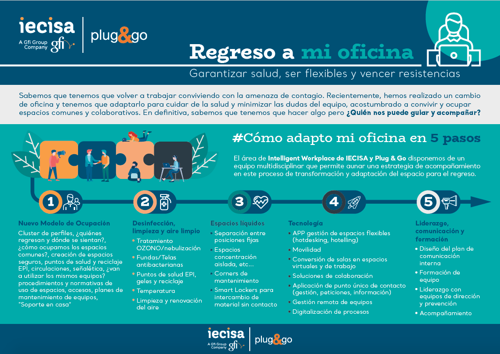 El equipo multidisciplinar de Intelligent Workplace de IECISA y plug&go Arquitectura Corporativa han decidido aunar talento y experiencia para acompañar a las empresas en el proceso de transformación y adaptación del espacio para el regreso de sus empleados a las oficinas pensando en modelos a medio y no soluciones temporales a corto.