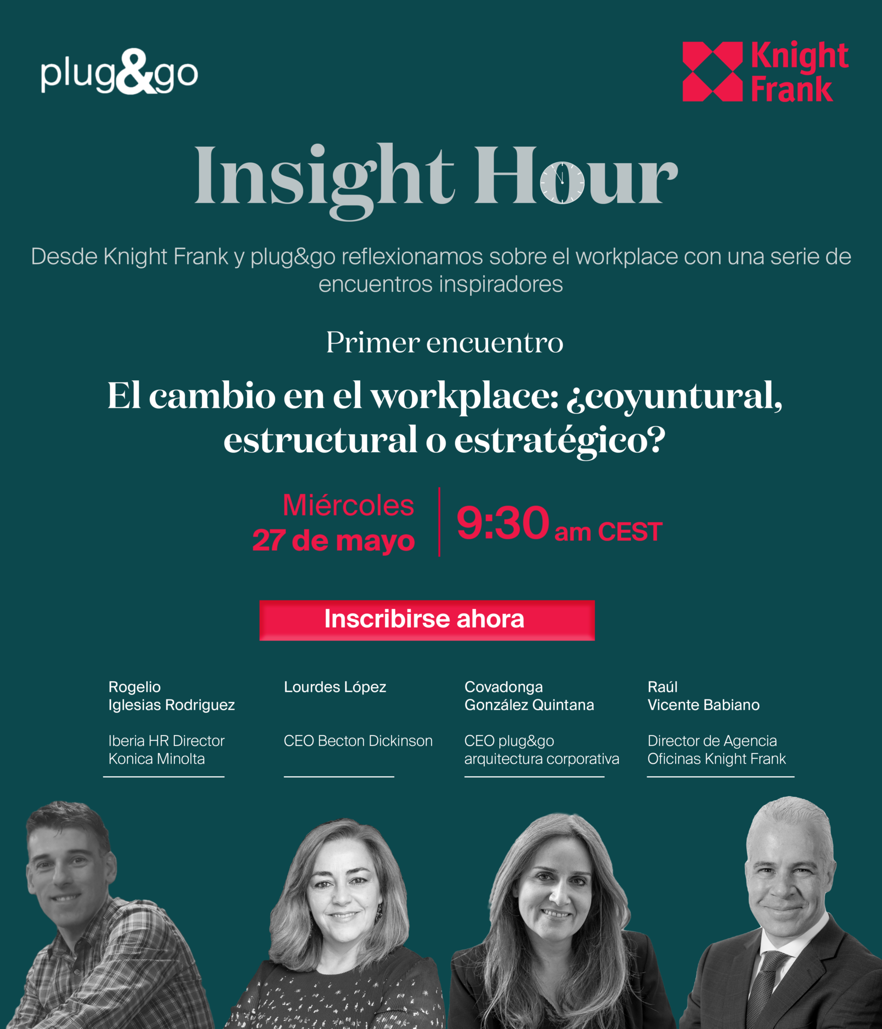 La consultora inmobiliaria privada internacional Knight Frank y plug&go arquitectura corporativa, presentan “ Insight Hour ”, un espacio inspiracional y de reflexión en el que de la mano de estos dos expertos inmobiliarios y de la arquitectura workplace, diferentes líderes del mundo corporativo, gestión de talento, consultoría estratégica, medicina y mundo del arte, entre otros ámbitos, compartirán aprendizaje y valoración sobre los espacios que usamos y habitamos.
