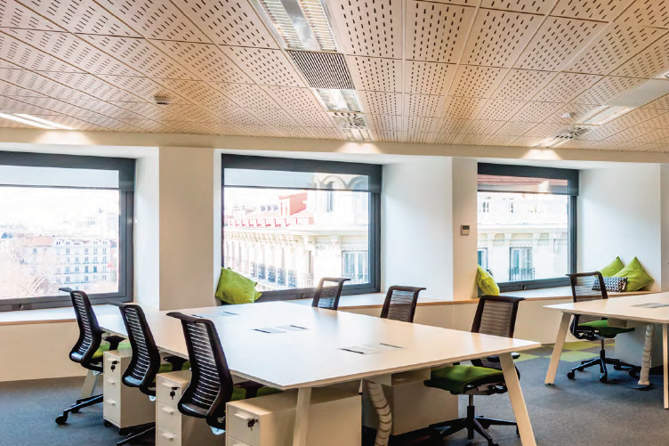 El diseño del espacio rompe la simetría de paralelas y perpendiculares y organiza los puestos de trabajo en diagonal aprovechando al máximo la singularidad de la fachada de este edificio propiedad de la inmobiliaria Colonial.